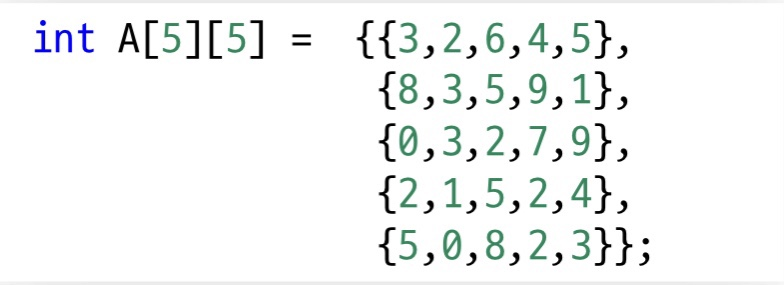 ● 정수 값들로 구성된 2차원 n x n 행렬이 배열 A에 저장되어 있다고 가정한다.